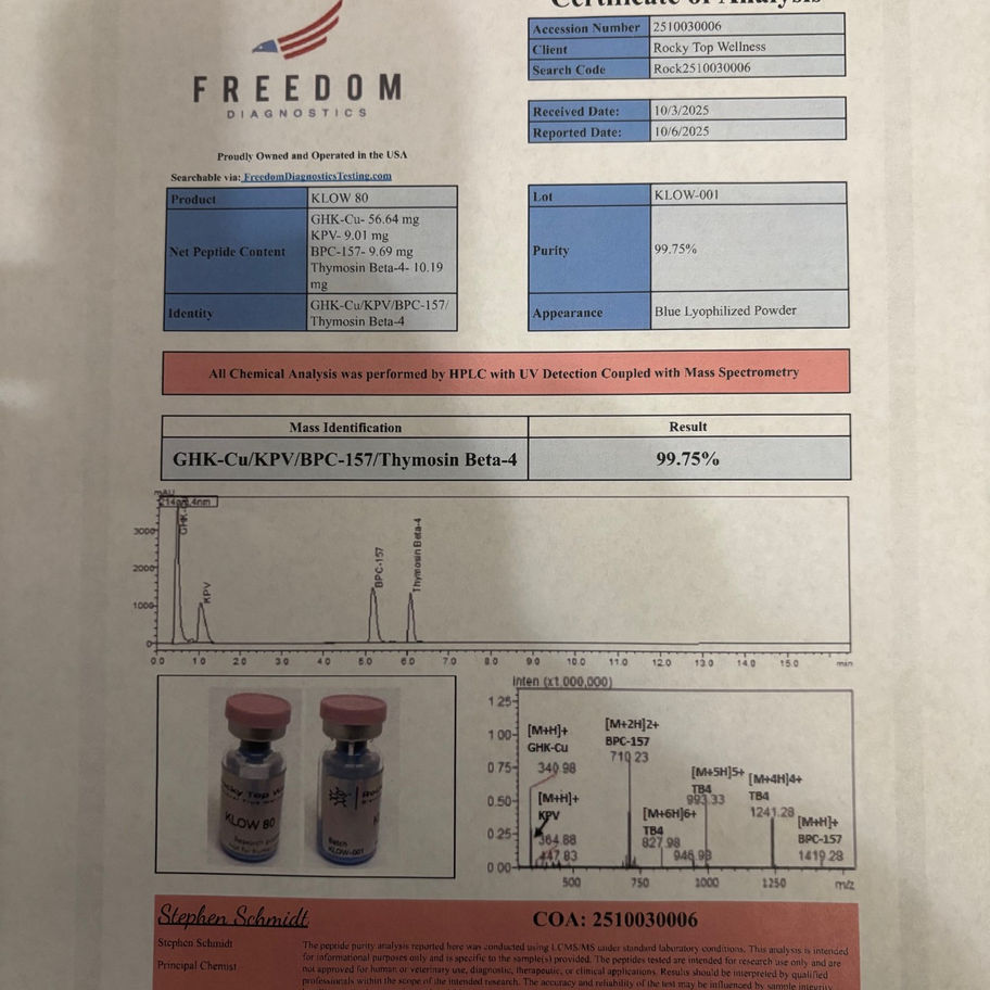 KLOW is a blue-colored lyophilized peptide blend combining four well-characterized research peptides: GHK-Cu, BPC-157, TB-500, and KPV. This synergistic formulation is studied for its potential roles in cellular repair, tissue regeneration, antiinflammatory action, and immune modulation. Each component has been the subject of extensive scientific research, and this combination allows for the investigation of multi-pathway biological effects in controlled laboratory environments.
